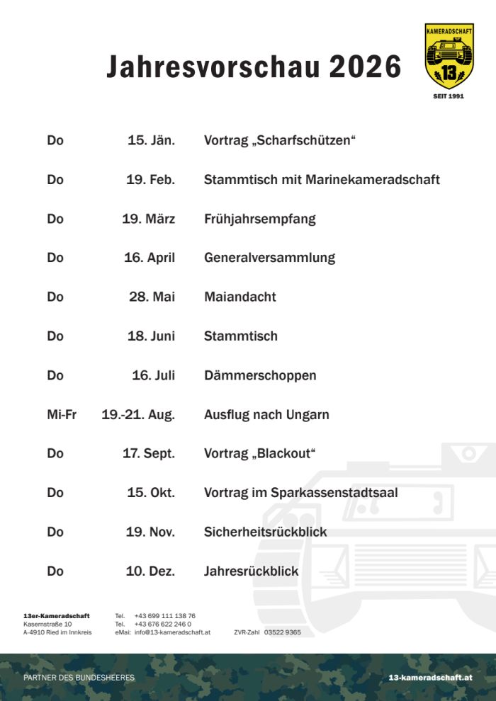 Die nächsten Highlights im Jahresprogramm der 13er-Kameradschaft werden der Besuch der am 2. September stattfindenden AIRPOWER, die 30-Jahr-Feier mit Buchvorstellung am 23. September in der Bauernmarkthalle und ein Vortrag des ObstdG Dr. Markus Reisner, PhD über den „Kampf um die Ukraine“ im Sparkassenstadtsaal am 13. Oktober sein.