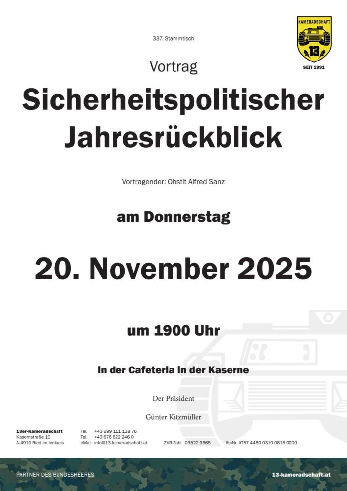 Die nächsten Highlights im Jahresprogramm der 13er-Kameradschaft werden der Besuch der am 2. September stattfindenden AIRPOWER, die 30-Jahr-Feier mit Buchvorstellung am 23. September in der Bauernmarkthalle und ein Vortrag des ObstdG Dr. Markus Reisner, PhD über den „Kampf um die Ukraine“ im Sparkassenstadtsaal am 13. Oktober sein.